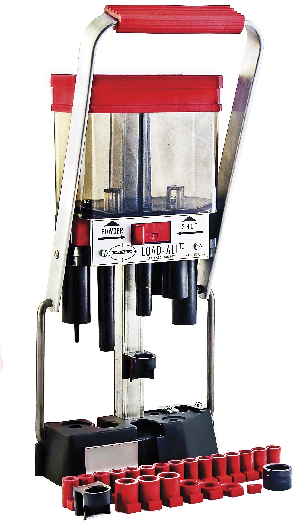 The Lee Load-All 2 offers the reloader a an inexpensive option when it comes to making cost effective shotgun shells. This press includes eight shot bushings that measure 7/8, 1, 1-1/8, 1-1/4, 1-1/2, 1-3/4 and 1-7/8 ounces. The 1-7/8 ounce bushing is a small tab that fits inside the charge bar. Also included with this press are sixteen powder bushings that measure: 095, 100, 105, 110, 116, 122, 128, 134, 141, 148, 155, 163, 171, 180, 189 and 198 cubic centimetres. Unlike other more expensive presses the Lee Load-All 2 also comes with 6 and 8 point crimp starters, safety charge bar, steel sizing ring, aluminium plate for primer catcher, spare wad guide, primer guide, spring and pin, one screw and two bolts with locking nuts. Additionally the 12 and 20 BORE models can load 3" shells without needing an expensive conversion kit.