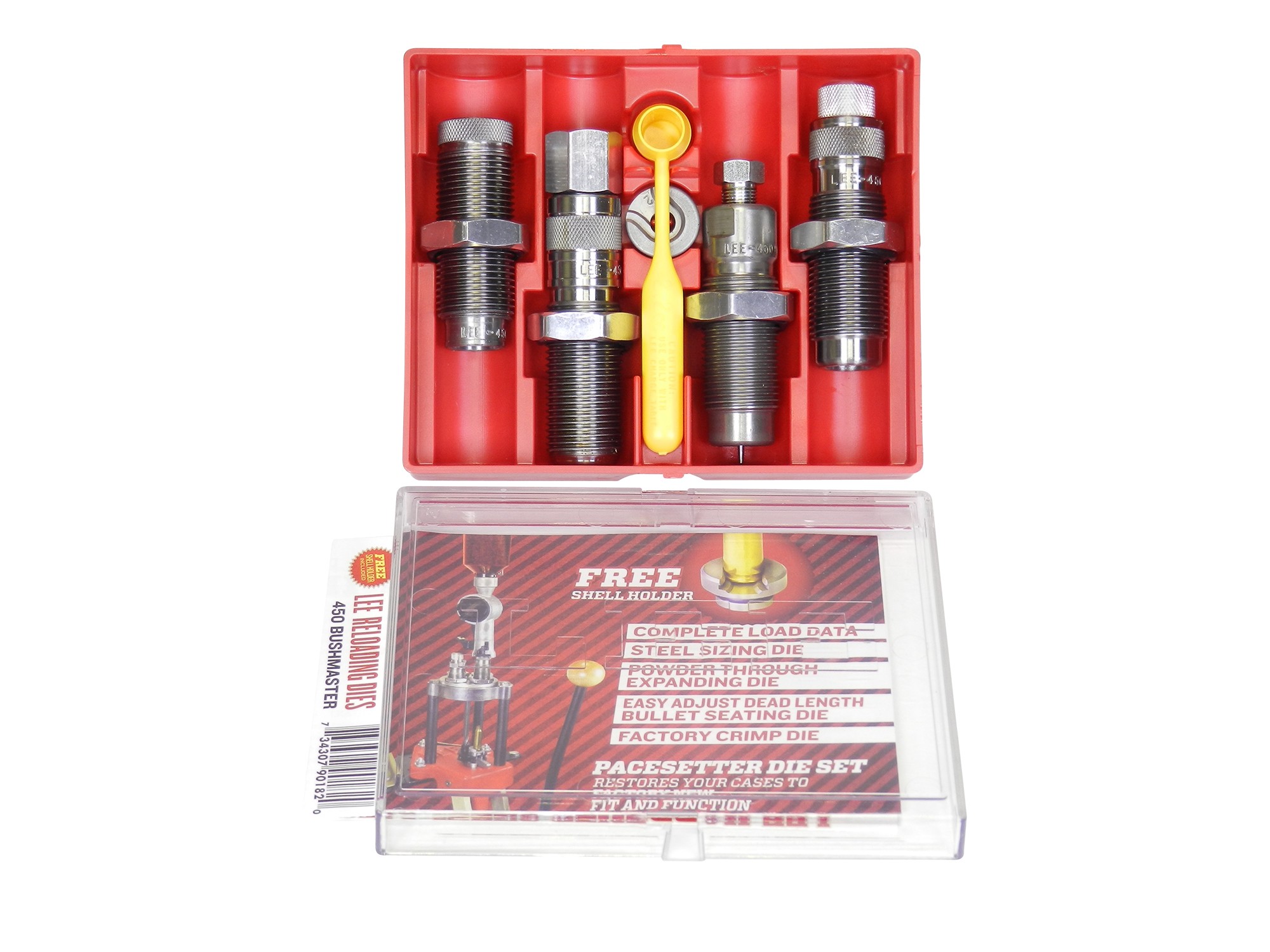 Lee Very Limited Production 450 Bushmaster PaceSetter 4-Die Set includes a Full Length Sizing Die, Powder Through Expanding Die, Easy Adjust Dead Length Bullet Seating Die, Factory Crimp Die, Universal Shell Holder, Powder Dipper and Instructions and Load Data.